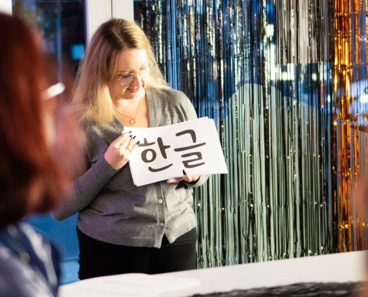 🗣Jednym z głównych punktów programu był wykład z podstaw języka koreańskiego❗ Nasi goście mieli szansę poznać popularne wyrażenia, które mogą przydać się podczas rozmowy z koreańskimi przyjaciółmi w podróży, a nawet podczas oglądania k-dram❗ Prelekcja ta przyciągnęła tłumy, a uczestnicy z entuzjazmem próbowali powtarzać nowe słowa i zwroty.
